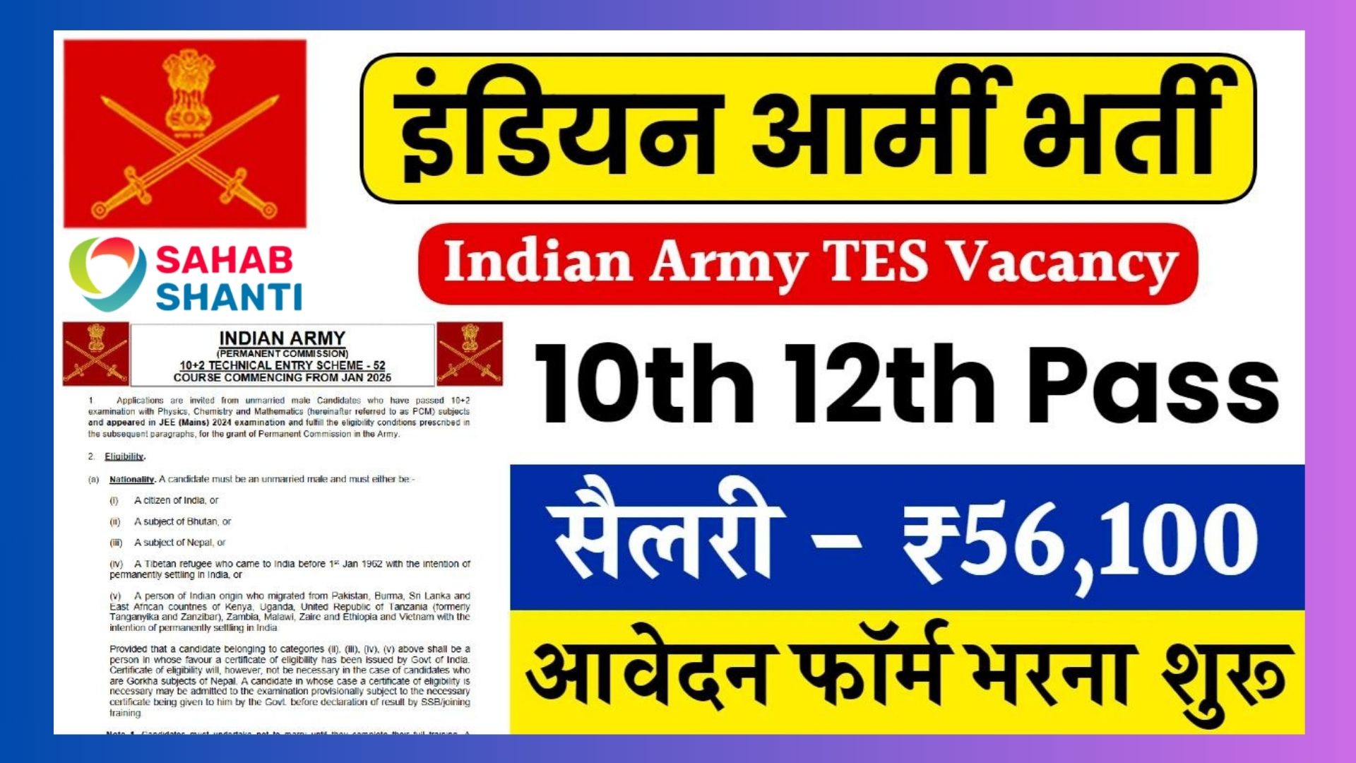 Indian Army TES Vacancy in 2024: जिनका बचपन से ही ऐसा सपना रहा है कि वह पढ़ लिखकर इंडियन आर्मी में सरकारी नौकरी प्राप्त कर सके तथा देश की सेवा में अपने महत्वपूर्ण योगदान को दे सकें तथा वे इसी सपने को पूरा करने के लिए दिन-रात मेहनत करने में भी जुटे हुए हैं। इंडियन आर्मी सेना में काम करने के इच्छुक अभ्यर्थियों का सपना अब पूरा होने वाला है क्योंकि जो अभ्यर्थी विभाग में सेवा देने की हेतु तैयारी कर रहे हैं उनके लिए इंडियन आर्मी के द्वारा टीईएस के मुख्य पद हेतु बाकायदा नोटिफिकेशन जारी किया गया है। टीईएस यानी टेक्निकल एंट्री स्कीम आर्मी के सबसे महत्वपूर्ण तथा मुख्य पदों पर सीधे भर्ती के लिए आर्मी विभाग के द्वारा हर वर्ष नोटिफिकेशन जारी करवाया जाता है जिसमें योग्य उम्मीदवारों को मुख्य पदों पर नियुक्त किया जाता है।